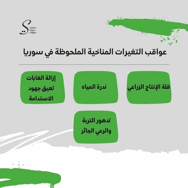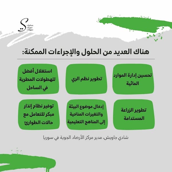من جهته، يشير شادي جاويش، مدير مركز الأرصاد الجوية في سوريا، إلى جملة من المخاطر في حال لم تقدم الحكومة حلولاً للتكيف مع التغيرات المناخية، مثل «تكرار موجات الحر نتيجة ارتفاع درجات الحرارة ما يؤثر على الصحة العامة وزيادة عدد حالات الوفاة، إضافة إلى التأثيرات الجوهرية على الزراعة والحياة البرية والاقتصاد».