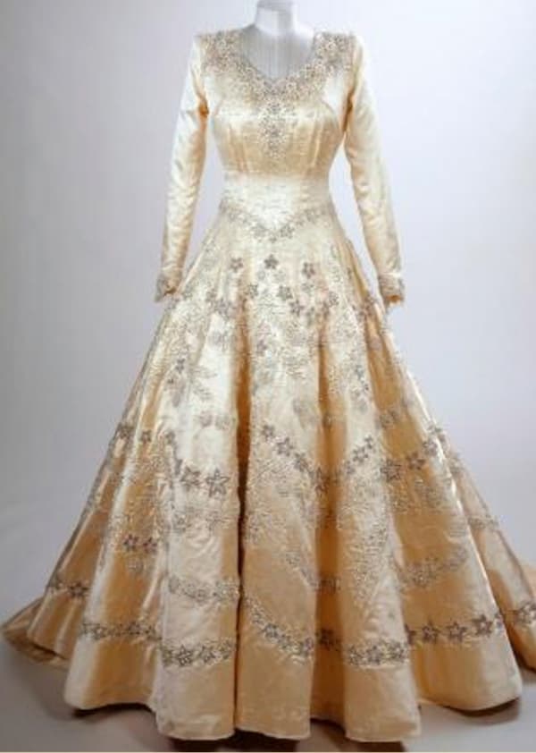 كان الثوب الملكي لعرس الملكة إليزابيث في1947 مصنوعاً من الحرير العاجي الصيني، والديباج الدمشقي من سوريا. وعند تنصيبها ملكة لبريطانيا في 1952، ارتدت فستاناً من الديباج السوري نُسج على نول يدوي يعود للعام 1890. الفستان محفوظ في متحف لندن / مصدر الصورة
