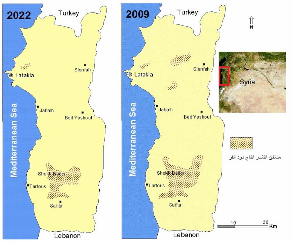 يشير تقرير «حالة غابات المتوسط» الصادر عن منظمة الفاو (FAO) العام 2018 إلى أن معدل انحسار مساحة الغابات في سوريا أصبح أعلى بنسبة 18.5% تقريباً مما كان عليه في العام 2015، أدى ذلك الى تراجع كمّي ملحوظ للعديد من الأنواع النباتية ومنها شجر التوت؛ الحامل الحيوي لدود القز، وانحسرت مساحات انتشاره في عموم الساحل السوري بنحو 30%، كما يقول عمر عبد الله، وهو منسق «مهرجان الحرير» في دمشق.