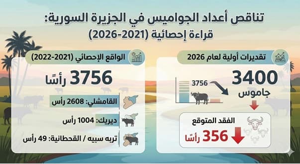 تعكس الأرقام الرسمية أثر هذه الأزمة على أعداد الجواميس في المنطقة. فبحسب دائرة البيطرة في القامشلي، بلغ آخر إحصاء للجواميس في الجزيرة خلال العامين 2021–2022 نحو 3756 رأساً، توزعت بين 2608 رؤوس في القامشلي، و49 رأساً في تربه سبيه/القحطانية، و1004 رؤوس في المالكية (ديريك).