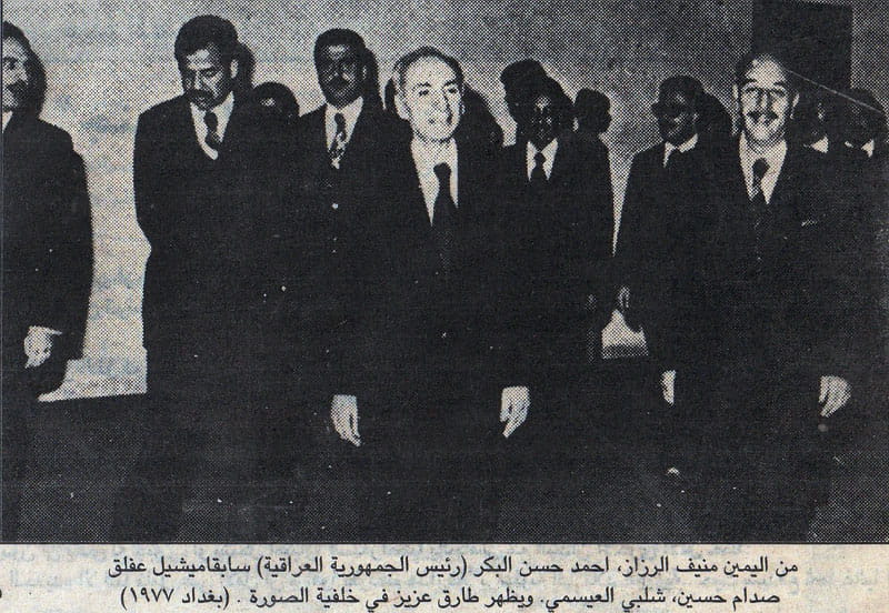 الصورة: موقع عائلة الرزازكان صدام يرغب أن يضمن لنفسه موقعاً في صفوف «الآباء المؤسسين للبعث»، وأن تكون له يد في أيديولوجيا الحزب نفسه، ولذلك أضاف عدداً من الكتب إلى مكتبة «البعث». لكن يقال إنّ عفلق هو الذي كتبها. وفي هذا السياق، نُقل عن صحافي سعودي زار عفلق في بغداد سنة 1988، للتوسط في السماح لسيدة عربية بمغادرة العراق بعد وفاة زوجها العراقي في ظروف غامضة، أن عفلق قال له: «هل تعتقد يا أستاذ أن تكون كلمتي مسموعة في العراق؟». فرد عليه ذلك الإعلامي: «إنك تتمتع بمنصب رسمي كبير، وهو الأمين العام لحزب البعث، الحزب الحاكم»، ليقاطعه عفلق قائلاً: «لا يغرك هذا المنصب، فهو منصب صوري لا يخولني أن أتعرض لأمر ما مهما كان شأنه كبيراً أو صغيراً» (مطيع النونو، دولة البعث وإسلام عفلق، القاهرة 1990).